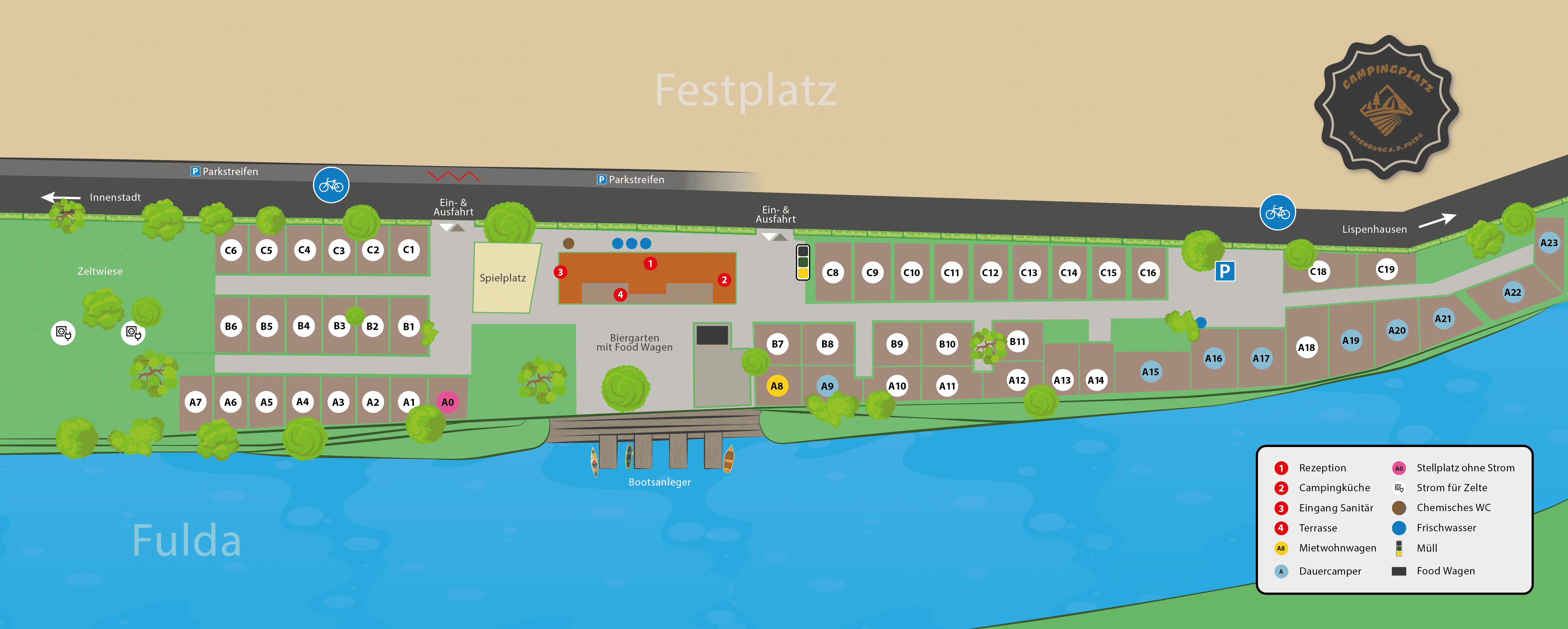 Unser Zeltplatz an der Fulda befindet sich – gemäß Platzplan – auf der linken Seite in Richtung Stadtkern und bietet ideale Bedingungen für naturnahes Zelten in Hessen.